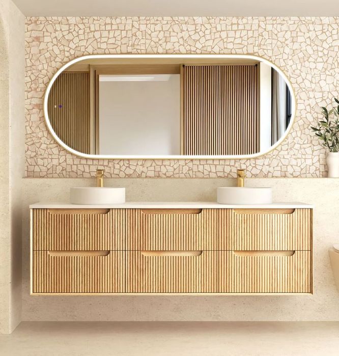 The Byron vanity features a natural oak finish, high moisture resistant plywood construction, soft edge finger pull handles, and Hettich hinges and runners for smooth and soft closing. The new Fluted veneer showcases detailed fine lines that add elegance to you designer bathroom.