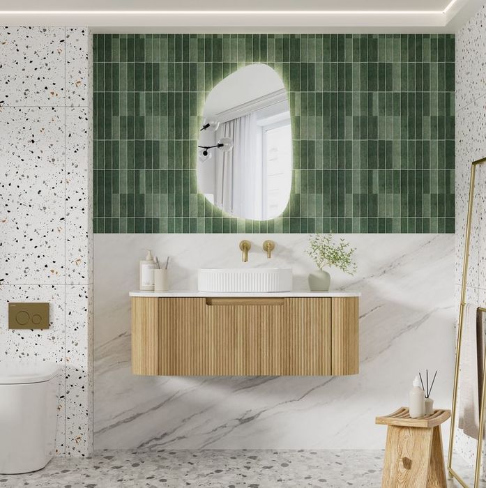 The Varcelli Mono Wall Hung Vanity complements modern bathroom aesthetics with its curved ends and sleek, floating design. Crafted from durable timber plywood in a warm Harvest Oak V-groove finish, it pairs beautifully with natural textures and soft lighting. Its spacious, soft-close drawers with graphite interiors and integrated organizers ensure effortless functionality.