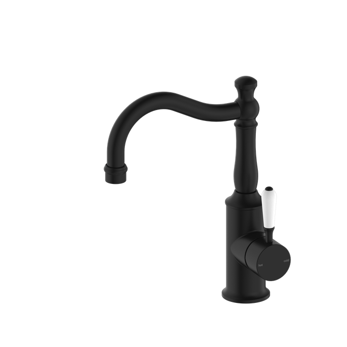 YORK BASIN MIXER HOOK SPOUT WITH WHITE PORCELAIN LEVER MATTE BLACK