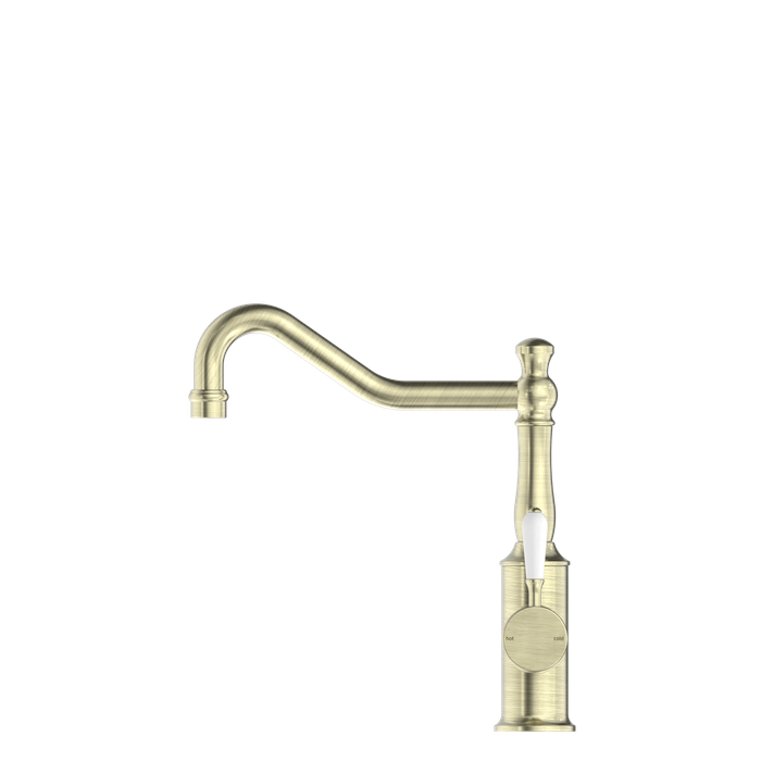 YORK KITCHEN MIXER HOOK SPOUT WITH WHITE PORCELAIN LEVER AGED BRASS