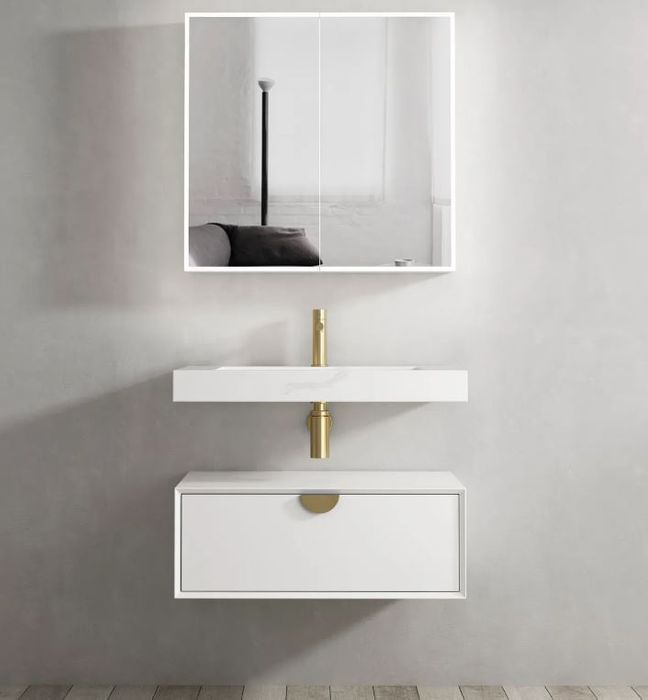 Inspired by the best in Spanish design, the combination of the Moonlight cabinets and luxurious solid surface aqua plane basin add refinement and luxury to any bathroom. Components are sold separately. This price is for the cabinet only.