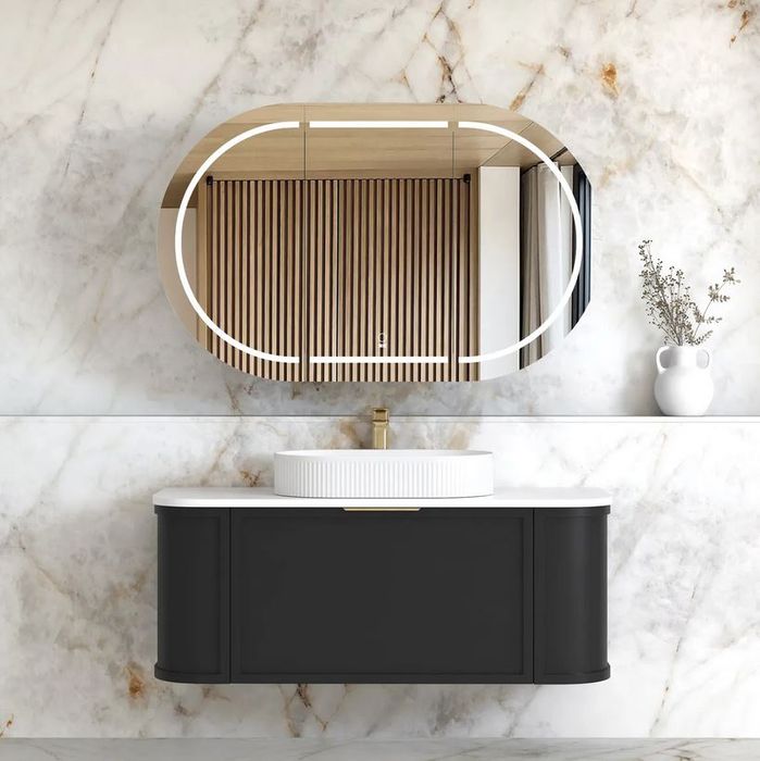 Drawing from classic furniture design, the soft panelled curved vanity is part of the latest in design and trends in bathware.
