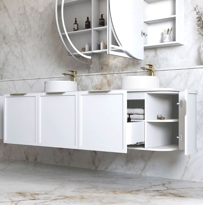 Drawing from classic furniture design, the soft panelled curved vanity is part of the latest in design and trends in bathware.