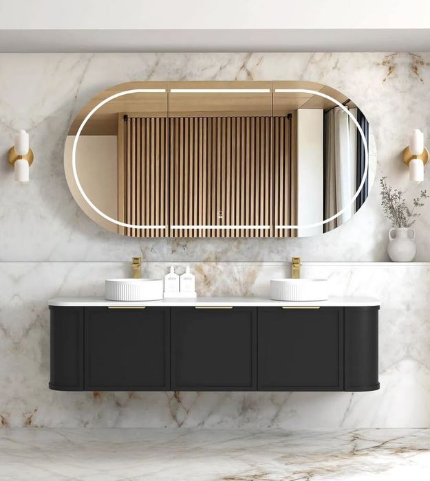 Drawing from classic furniture design, the soft panelled curved vanity is part of the latest in design and trends in bathware.