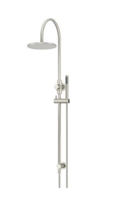 Introducing the latest addition to our shower collection, the Meir Gooseneck Shower Set in Brushed Nickel. With its unique universal water inlet, this shower can be installed with either a top or bottom water connection, making it suitable for both existing and new homes.