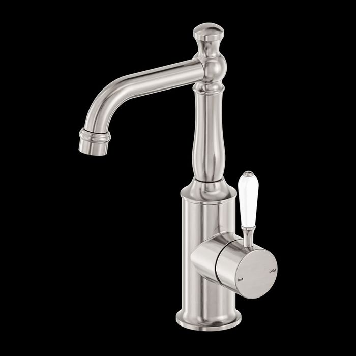 YORK BASIN MIXER WITH WHITE PORCELAIN LEVER BRUSHED NICKEL