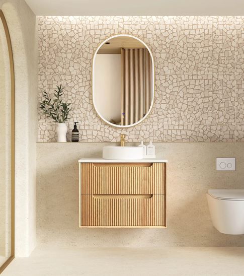The Byron vanity features a natural oak finish, high moisture resistant plywood construction, soft edge finger pull handles, and Hettich hinges and runners for smooth and soft closing. The new Fluted veneer showcases detailed fine lines that add elegance to you designer bathroom.