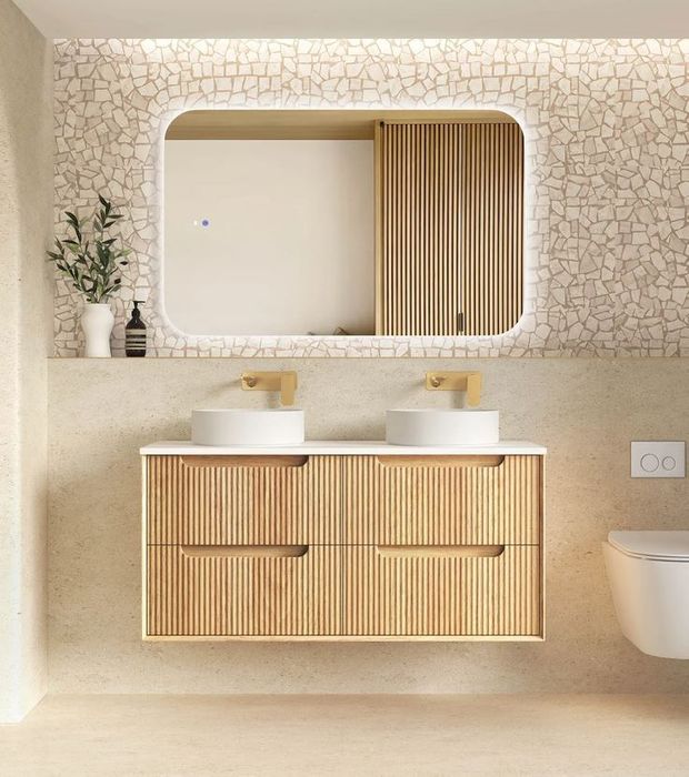 The Byron vanity features a natural oak finish, high moisture resistant plywood construction, soft edge finger pull handles, and Hettich hinges and runners for smooth and soft closing. The new Fluted veneer showcases detailed fine lines that add elegance to you designer bathroom.
